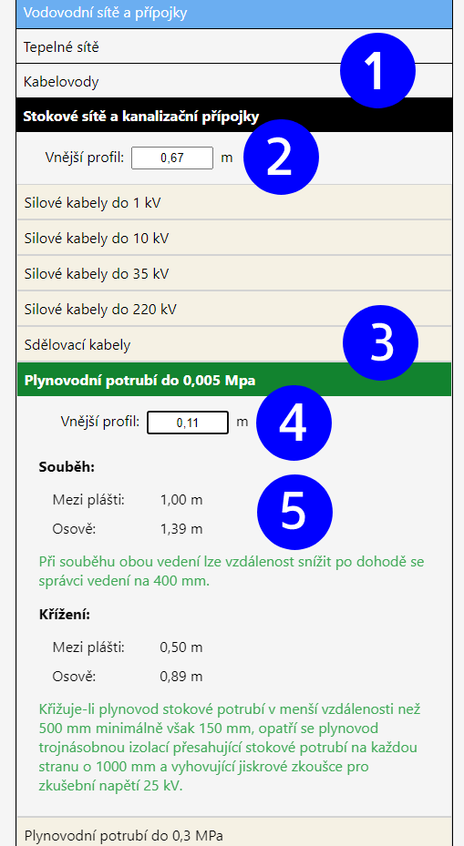 Webová pomůcka pro vyhledání nejmenší dovolené vzdálenosti při souběhu a křížení podzemních sítí.