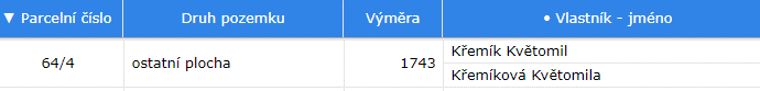 Během řazení dochází k seskupování řádků. Při řazení podle čísla parcely, pokud má parcela více vlastníků, neopakuje se pro každého z nich na novém řádku. Je rozdělena na vnitřní řádky pouze ve sloupcích týkajících se vlastníků. A stejně to funguje při řazení podle vlastníků, pouze obráceně1.