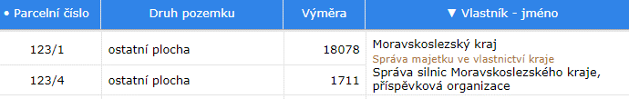 Kromě výběru položky v ovládacím menu se dá řazení rychle provést kliknutím na záhlaví příslušného sloupce – Parcelní číslo nebo Vlastník – jméno.