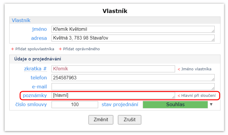 Tato speciální hromadná úprava se může hodit zejména při načítání z katastru, kdy někdy dochází k tomu, že u různých parcel je stejný vlastník uveden trochu jinak (malá a velká písmena, pořadí slov). Spuštěním této funkce je zachována jedna varianta zápisu vlastníka a ostatní jsou smazány. Kterou variantu použít nastavíme tak, že k ní přidáme poznámku „[hlavní]“ pomocí tlačítka Hlavní při sloučení vedle políčka poznámky2.