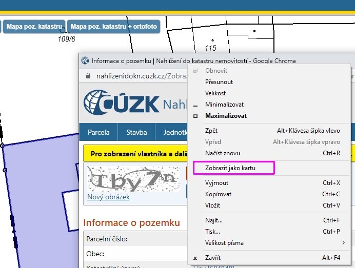 Pokud použijeme mapový prohlížeč NKN a informace zjistíme kliknutím na parcelu, zobrazí se v samostatném okně, které nemá hlavní lištu. Dostaneme se k ní kliknutím pravým tlačítkem myši na záhlaví okna a výběrem položky Zobrazit jako kartu8.