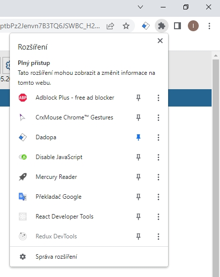 Na hlavní liště prohlížeče, vpravo vedle pole adresy, se objeví ikona aplikace Dadopa, pokud ne, najdeme ji v seznamu rozšíření, který se otevře po kliknutí na ikonu Rozšíření. Na lištu ji můžeme připnout7.