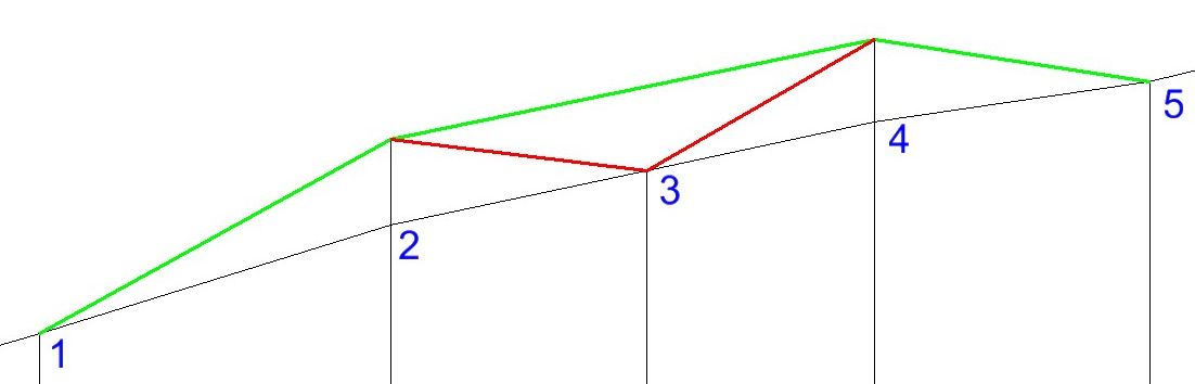 Na rozdíl od WP neprovádí JPP interpolaci upravených terénů. Jak je zobrazeno na obrázku 4, pokud v situaci zadáme kóty upraveného terénu do bodů 2 a 4, bude upravený terén v bodech 1, 3 a 5 roven rostlému terénu. Zatímco v bodech 1 a 5 je to v pořádku, v bodě 3 tomu tak být nemusí v případě, že upravený terén má tvar zakreslený zelenou čarou. Pak potřebujeme, aby se kóta upraveného terénu v bodě 3 vypočítala interpolací. Vyneseme PP, ve WP u bodu 3 zrušíme upravený terén (zrušíme zaškrtnutí a potvrdíme změnu). WP provede interpolaci kóty a my ji opíšeme do situace. Při vytváření PP v dalších krocích už bude mít upravený terén požadovaný tvar.